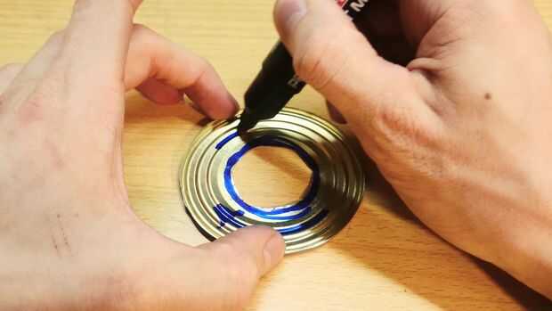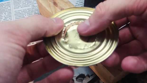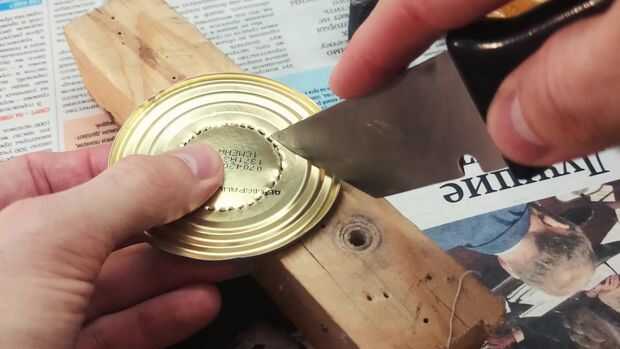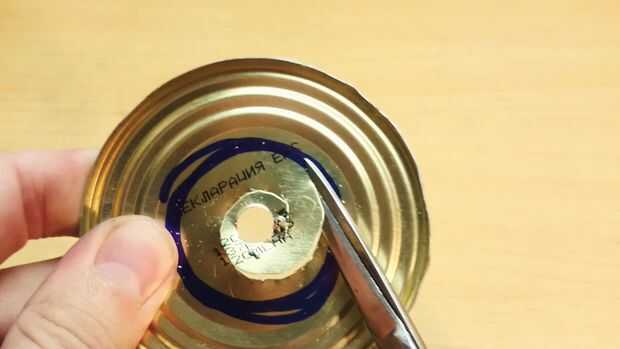 Ahora tenemos que hacer un agujero muy grande en la tapa de la lata. Puede jap un contorno y romper un pedazo de círculo, o puede perforar un agujero y agujero con las tijeras. La centrifugadora se gira hacia la derecha de torsión de la tuerca en el perno, que se mantenga en el eje del motor.