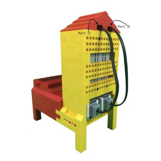 Después de montar se necesita conectar los motores para el ladrillo inteligente. Para hacer esto, necesita primero sacar los pedazos de techo rojo de la parte superior de la máquina. Se abrirá espacio para conectar los cables. Ahora, (mirando hacia el frente de la máquina) conectar el motor a la derecha "Puerto d" y conectar el motor a la izquierda a "Port A" usando los cables incluidos en el Kit de LEGO MINDSTORMS EV3. Vuelva a colocar los ladrillos de techo rojo.