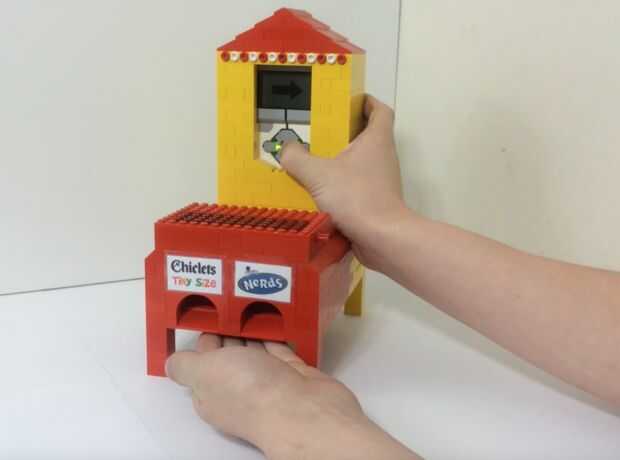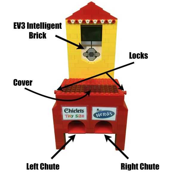 Para operar la máquina, primero asegúrese de que está ejecutando el programa de Candy Machine en su ladrillo inteligente de EV3. La pantalla luego debe mostrar el texto: "Máquina del caramelo". Ahora, simplemente pulse el botón izquierdo o derecho dependiendo de que candy le gustaría. Los botones izquierdos y derecho se corresponden con la izquierda y los derechos de candy. Por ejemplo, si quieres que el caramelo del lado derecho (que pasa a ser Nerds de Wonka en mi caso) Pulse el botón derecho. Una flecha aparecerá en la pantalla para indicar de qué lado usted ha elegido. Pulsando el botón de centro después de que se ha elegido un lado dispensará el caramelo del lado deseado.