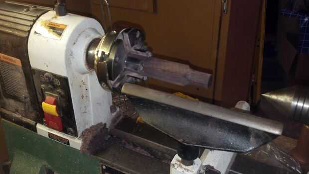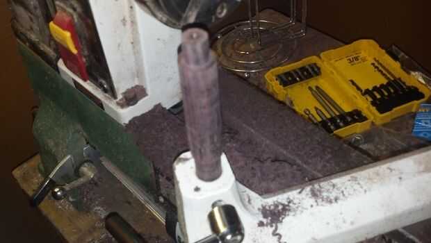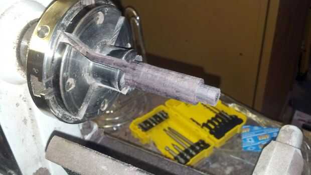 Probablemente hay un término real para este dispositivo, pero voy a llamarlo un post de fresa. Más tarde se utilizará para mantener el engranaje de la herramienta mientras se cortan los dientes. Para hacerlo, basta con una espiga de 5/8 de pulgada de una madera densa y entonces a una espiga de 1/2 pulgada en un extremo de la espiga. La pieza resultante debería encajar directamente en el resto de la herramienta.