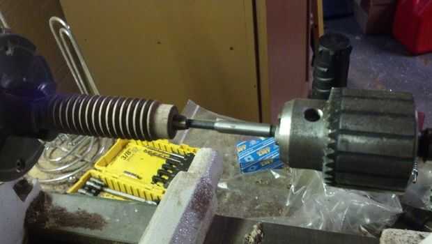 Idealmente, usted debe hacer esto antes de cortar los hilos, pero no es el fin del mundo si no lo hace. Cortar agujeros de 3/8 pulgadas aproximadamente la mitad de una pulgada en ambos extremos del tornillo sin cabeza. Cuando se monta la máquina, se pegue taquetes en estos agujeros que sirvan de ejes.