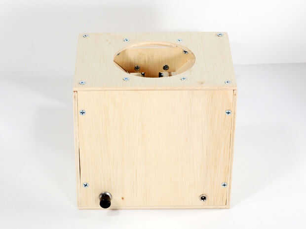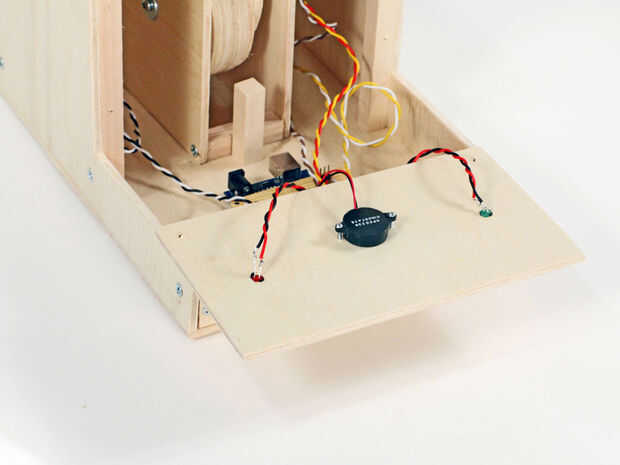Fije el interruptor de clavija y programación en la parte posterior de la caja con sus accesorios de montaje. Si usted está haciendo una caja transparente, coloque los LEDs blancos para iluminar la acción. Apretar una abrazadera pequeña alrededor de la base de cada LED blanco y fijarla con una chincheta. Lugar LED #1 detrás de la columna de lado derecho apuntando hacia adentro y 2 LED en la parte inferior del embudo dosificador, apuntando a la bandeja de gumball. Utilice los sujetacables restantes para asegurar y administrar los cables dentro de la caja. Atornille el panel de golpe en su lugar. Tornillo de los lados de la bandeja de chicle a la bandeja de la gumball y atornillar la bandeja en el poste de soporte de la bandeja. Antes de introducirlo definitivamente, revise el gumball claro contra la rueda dispensadora y el panel de acceso. Pegarse un pie de goma en cada esquina de la parte inferior para evitar que la máquina resbale alrededor de como golpear personas. Por último, fije el panel de acceso. ¡ Listo!