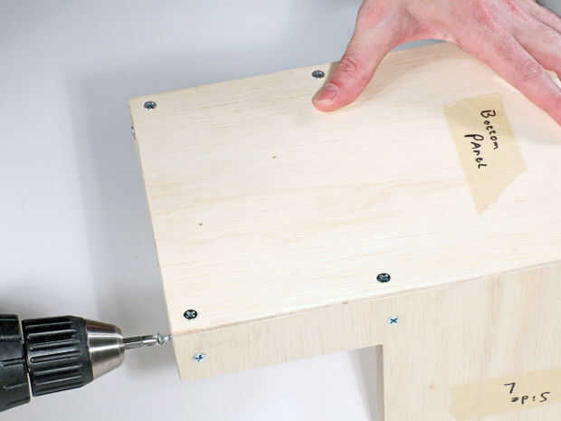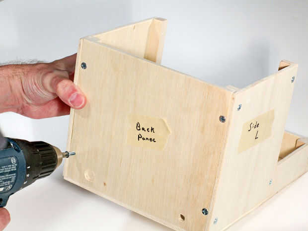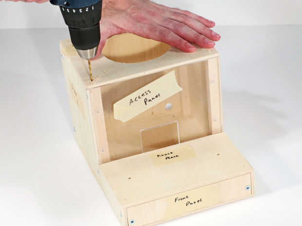 Ahora ya cortamos las piezas necesitamos para unir la parte inferior y panel frontal a los laterales. Taladre los agujeros para el enchufe y el interruptor de programación en el panel posterior, luego fije los paneles laterales. Prueba la placa de golpe, panel superior y el panel de acceso para el ajuste y perfore previamente los orificios, pero no conectar aún.