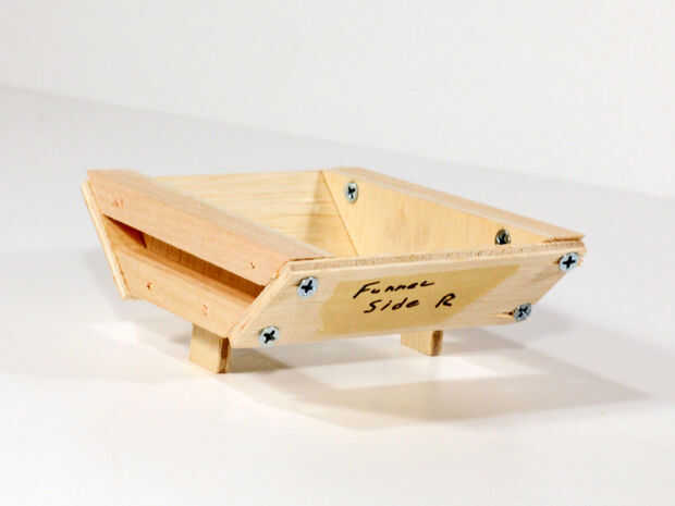 Ahora tenemos que hacer un túnel de gumball para unir los rieles superior e inferior para cada pieza de extremo del embudo. Fijar las piezas del lado de embudo a los extremos del embudo. Asegúrese de poner los rieles en la parte exterior del embudo. Coloque el embudo terminado en la parte inferior de la placa superior con 4 tornillos.