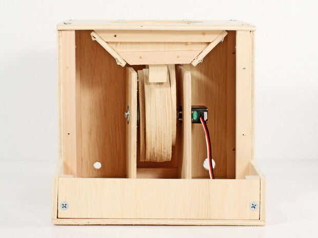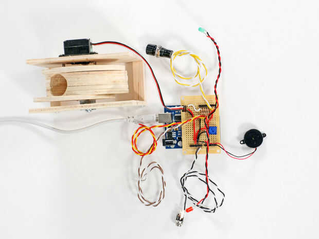 Prestar especial atención a la polaridad de los LEDs (pata más larga es positivo) y conector de alimentación (pin del centro es positivo). Omitir el 2 LEDs blancos y 100Ω resistencias si usted no está haciendo un caso transparente. Enchufe el escudo terminado en la parte superior de la Arduino, alinear los 8 pines con pines digitales 0-7. Conecte el servo en el cabezal de 3 pines en el escudo, teniendo cuidado de observar la polaridad (ya conectar el servo en hacia atrás puede dañar). Conectar el Arduino al ordenador con un cable USB. Descargar el archivo de código y lo subo a la Arduino.After usted sube el bosquejo (o aplica energía por primera vez) todos los LEDs se iluminarán, y el servo debe girar la rueda dispensadora para su ubicación inicial. Cuando las luces se apagan, está listo para un golpe. Gire el potenciómetro de sensibilidad hacia abajo hasta que el LED verde deja de parpadear. Si la luz permanece encendida sin importar cuánto usted gire, revise el cableado del sensor piezoeléctrico para cortocircuitos o conexiones en mal estado. Para prueba, ajuste la olla para que la luz verde dejará de parpadear sin ninguna entrada, pero golpeando suavemente el knock sensor hace parpadear. Toque al ritmo de "Afeitado y un corte de pelo". El LED verde debe parpadear y debe girar el servo. Si usted incluye los LEDs blancos, debe parpadear #1 y #2 debe permanecer encendido durante unos segundos. Si se introduce un ritmo incorrecto, debe parpadear el LED rojo. Presione el botón de programación y LEDs rojo y verde deben encenderse. Toque un ritmo nuevo, suelte el botón y espere a un segundo. Las luces roja y verdes deben echo el ritmo visual, y aprovechar este nuevo ritmo debe girar el servo. Reiniciar o desconectar el Arduino volverá al valor por defecto de "afeitado y un corte de pelo