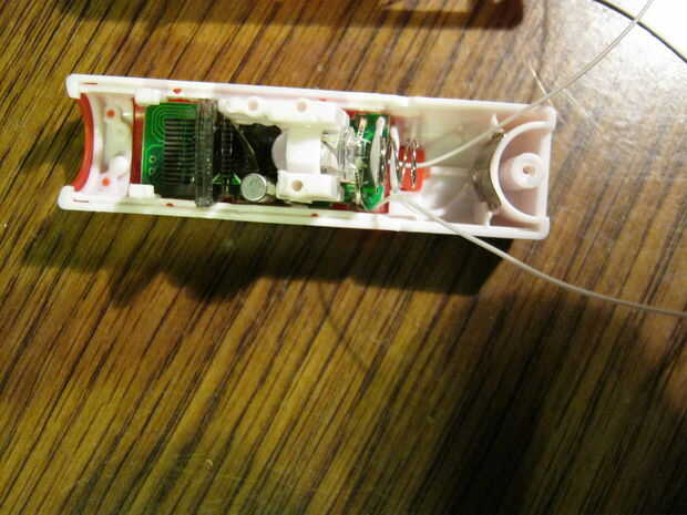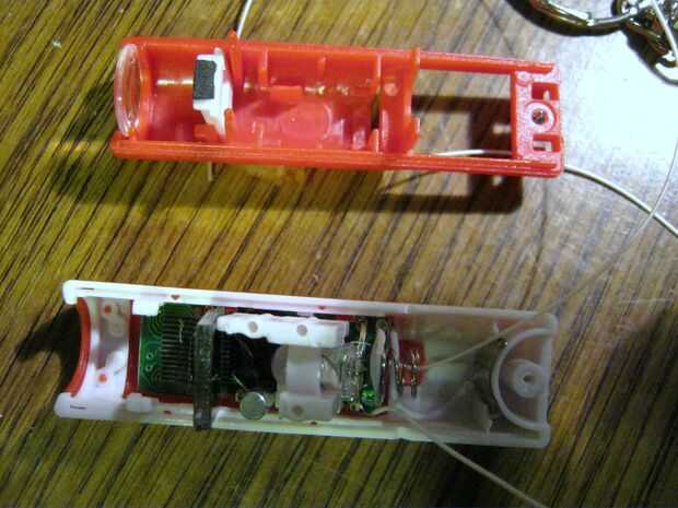 Parece haber dos o tres versiones de estos llaveros de reloj de proyección. Solo tengo un tipo por lo que sólo puede decir cómo modifiqué mina. El concepto básico es para sujetar los cables a donde va el botón principal para simular un empuje de botón.