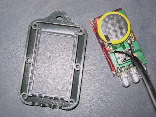 La cubierta de la luz solar llavero tiene un inserto de plástico cuadrado para el botón. Me llevó esto a cabo y funcionó los cables por el agujero. También quité el llavero y corbata envuelto los cables a la ficha para el alivio de tensión. (ver imagen)