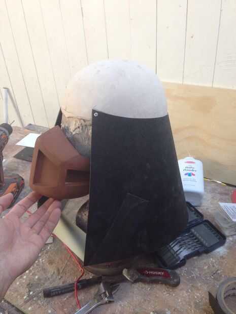 Después de que la tapa estaba listo y bastante redonda, lo envolvió en una hoja de ABS negro para darme la forma general que cubre las mejillas del cuello.