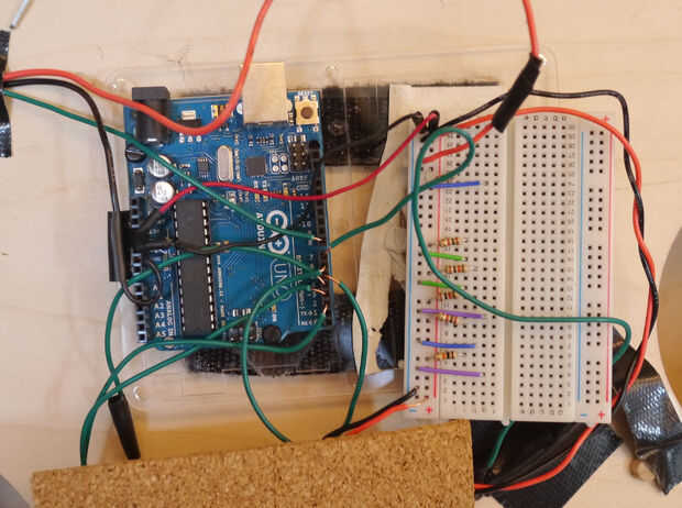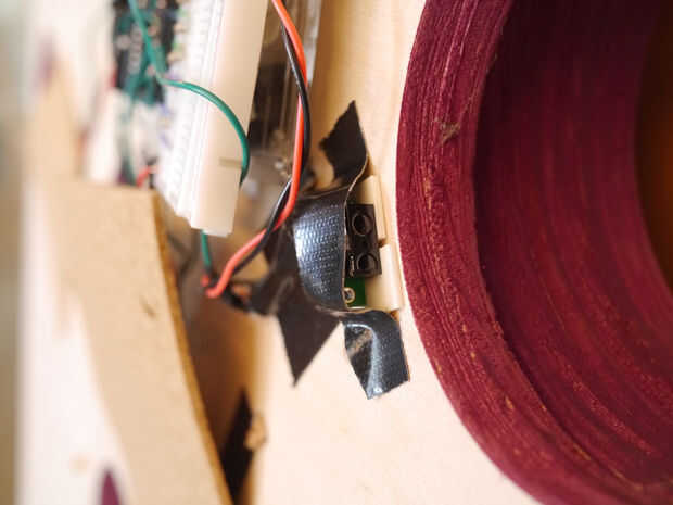 Todo esto se lleva a cabo en lugar por la cinta gorila que parece extraño. Esto no pretende ser la versión final. Todas las piezas sólo se encontraron el día anterior la Maker Faire. El objetivo era sobrevivir Maker Faire y funcionó en el lado de la electrónica. La próxima versión tendrá soportes 3D impreso y escudo para todos de la electrónica.