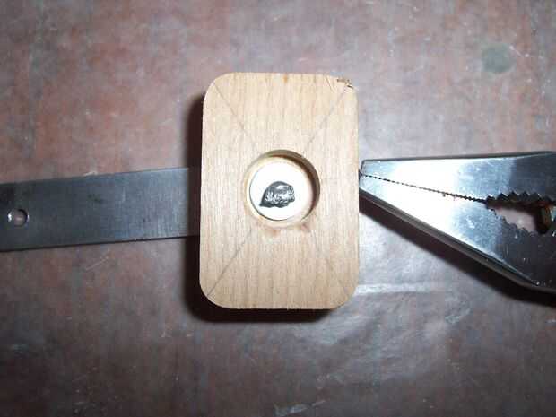 Puede ser más fácil golpear el "tallo" restante de remache. Este es el final de la bola de la varilla de acero que se rompe y es utilizado a flair el remache. Utilizando un pequeño punzón o la barra de acero que se desató este grifo de la parte acampanada. Encontré el remache de flexión más fácil. Utilice un par de pinzas y aplastar el diámetro del remache para hacerla plana. Luego doblar el material así que va muy por debajo del jabalí de contador.