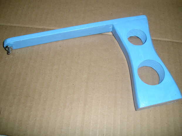 Se trata de un cierre para arriba de un brazo para la máquina azul. Todos son similares. Estas dos piezas están hechas de madera de pino común, 3/4 de pulgada de espesor. El brazo de uno mismo es cerca de 8 pulgadas de largo por 3/ 4 por 1/ 4 pulgada pedazos son pegados y atornillados para fuerza.