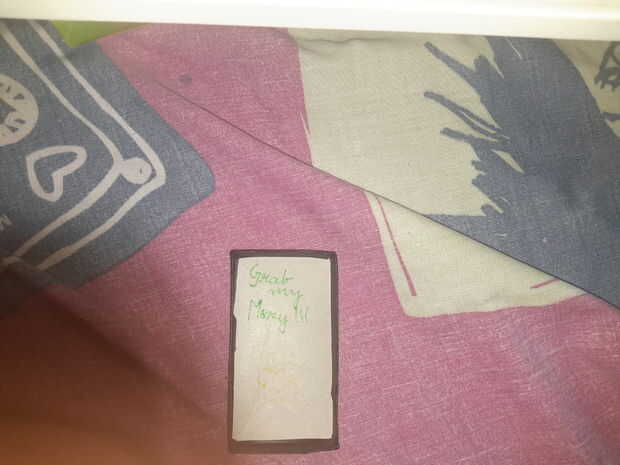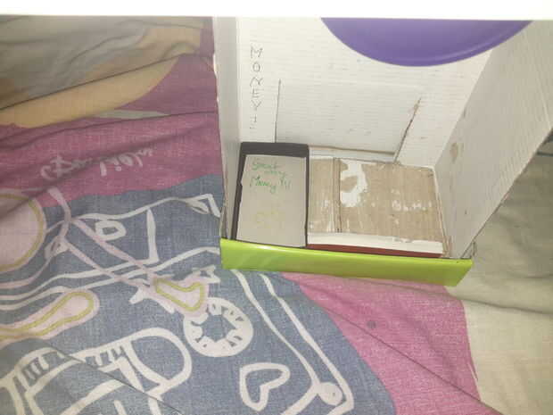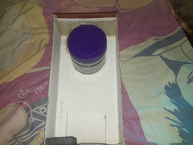 8. tomar una pequeña tapa o algo para que cuando usted pone el dinero a través de la ranura cae en la tapa y usted puede sacar el dinero fácilmente. Asegúrese de que se mantiene recto por la raja y no pegarlo lo contrario es difícil retirar el dinero.
