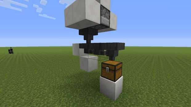 Por debajo de la tolva Coloque 2 tolvas más hacia el frente. Luego otra tolva al final de esa fila hacia abajo. Y debajo de ella un cofre con un bloque debajo de él.