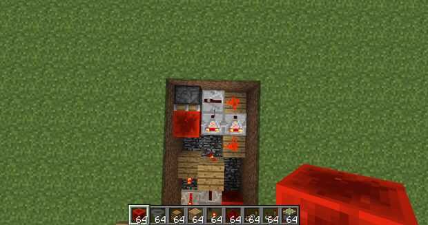 En primer lugar, coloque un pistón pegajoso con el lado adhesivo en la parte delantera y coloque un bloque de redstone en el lado pegajoso.