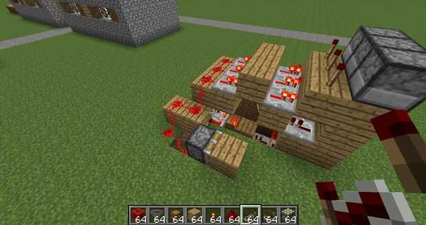 En el lado del bloque en el espacio profundo 2 hacia el frente, coloque una antorcha de redstone. A la izquierda de él, colocar un pistón pegajoso hacia el frente. Coloque un bloque sobre el lado pegajoso.