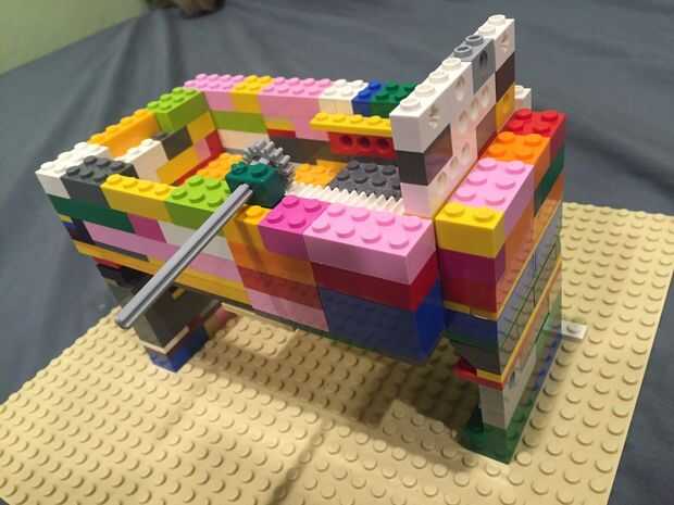 Ahora que tenemos la mayor parte de la estructura hacia abajo, tenemos que empezar a trabajar en lo mecanismo. Aquí es donde la magia sucede. Primero consigue un trozo de varilla larga. Conecte un equipo a la barra. ¿Tienes? Buena. Si usted necesita ayudar a mirar el cuadro de cambios y varilla. ¿Ahora, recuerdo que hicimos hace unos pasos la casilla? Bueno la idea aquí es que el engranaje gira en los remaches causando el cuadro de mover. La caja va por encima del área de agujero y cae todo lo que debe descartarse. A continuación se gira el engranaje hacia atrás para hacer la caja vuelva a su estado original. Para mover la barra de la caja, tenemos un pedazo de agujero. Echa un vistazo a la foto de arriba. Poner la varilla a través de esta pieza y asegúrese de que se puede girar. Una vez que has conseguido bajarla estratégicamente colocar tal que se puede mover el cuadro. Te sugiero ponerla alrededor de 2,5 pulgadas lejos del lado derecho de su máquina. Si usted necesita ayudar a mirar la imagen. Descargar y ver el vídeo también. Si funciona al igual que el video luego lo hiciste correctamente. ¡Buen trabajo! Nosotros no estamos hecho todavía aunque...