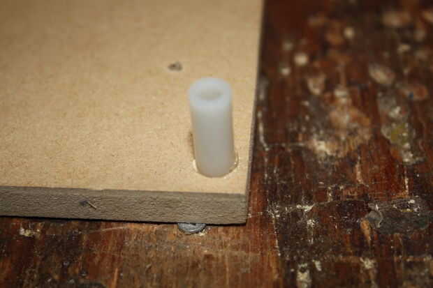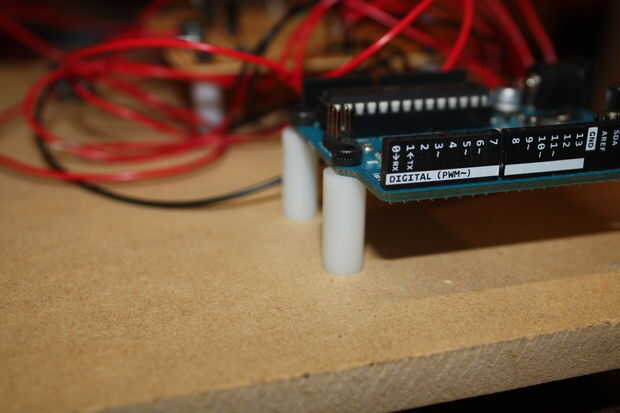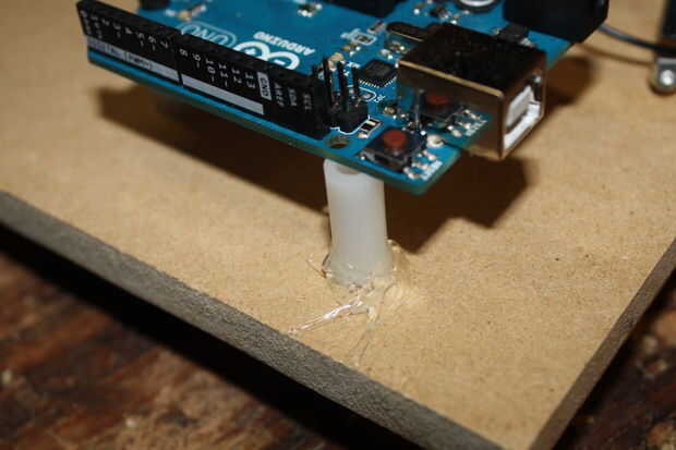 2. Para apoyar el tablero debajo del orificio de montaje uno que no puede caber ningún tornillo, debemos caliente pegamento un espaciador, cuidado de no añadir demasiado mucho directamente debajo de ella como esta pondría presión sobre Arduino