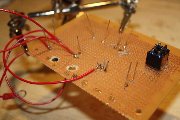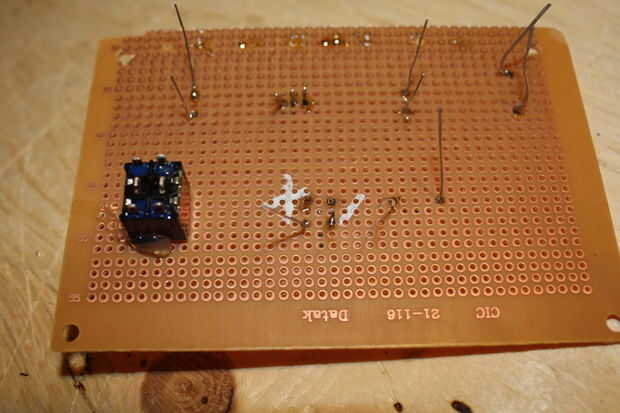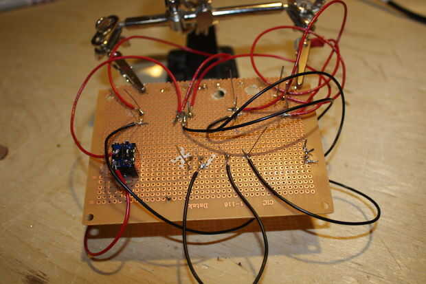 - Colocar todos los componentes en el tablero, espacio dependiendo de que nivel de habilidad y si no ha utilizado una placa de circuito perforada antes de la soldadura (yo nunca había usado uno antes y estoy terrible en soldadura, por lo tanto, me aseguré de dejar suficiente espacio para los cables de puente vamos a añadir más tarde)