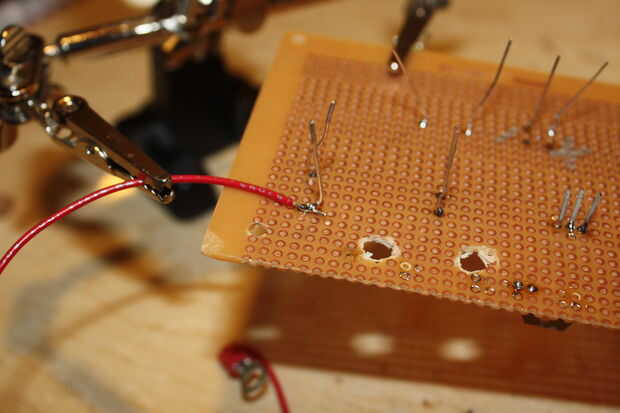 - Comience cortando y soldando los cables de jumper entre los diferentes componentes, utiliza el esquema proporcionado para la referencia. Te recomiendo que uses varios colores de hilo para distinguir entre las conexiones positivas y negativas