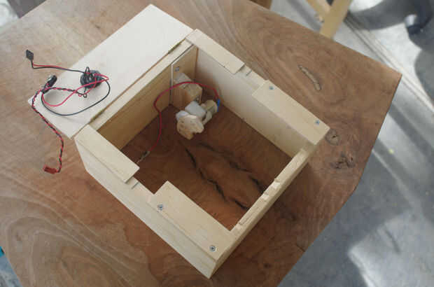Aquí le damos las paredes de la caja con adjunto parte no deslizante de la tapa con interruptor. Motor está montado dentro de la caja en la pared frontal. Aquí puedes ver motor palanca así. Atención una tira de madera amplia en la parte superior. Sirve como carriles para la tapa se deslice hacia atrás y la fuerza.