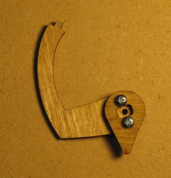 Diseño del brazo y la leva como se muestra. Utilice los 2 tornillos #4 x 3/8 para montar la leva. La orientación de la cam es importante. Asegúrese de que el ángulo entre el brazo y la leva coincide con como se muestra en la imagen. Si su cámara está montada al revés, el brazo no caerá por debajo de la tapa de la máquina inútil.