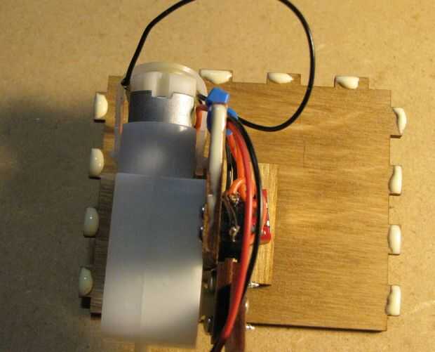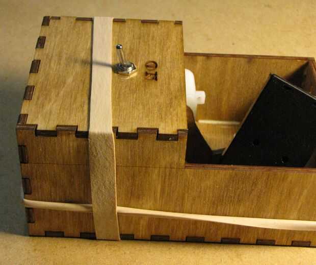 Aplique pegamento a todas las pestañas en la parte superior así como en cuanto a la parte inferior fina de la placa grande. Inserte la tapa en el ensamblaje de fondo y una banda de caucho se aplica mientras el pegamento seca.