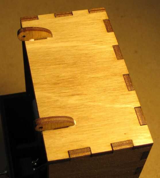 Coloque unos pequeños toques de pegamento en las ménsulas para bisagras ubicados donde reunirán las bisagras de la caja y la tapa. Coloque la tapa en la caja para verificar la alineación de las ménsulas para bisagras ubicados a un lado y permitir que el pegamento se seque.