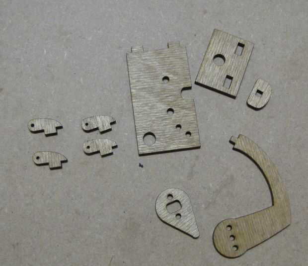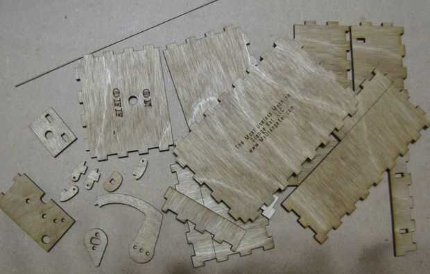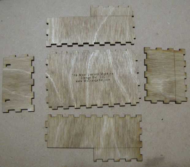 Utilice los planes adjuntos al laser corte su máquina inútil en material de 1/8. Se utilizó abedul de este instructable. Terminarás con las piezas que se muestra en las imágenes adjuntas. Hay básicamente 3 subconjuntos que componen su máquina inútil. La base de la caja, la tapa de la caja y los mecanismos internos que consisten en un conjunto de leva y los soportes de montaje.