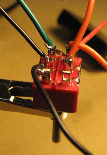 Tomar los restantes cables rojo y negro y 1/4" de cada uno de los extremos de la tira. Estos cables se sueldan sobre el interruptor. El cable negro a la parte superior central terminal y el cable rojo a la parte inferior central terminal.