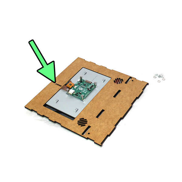 Aplique un pegamento de madera y coloque el marco con la ranura plana en el otro, asegurándose que la ranura en la parte superior esté más a la izquierda cuando se mira en la parte trasera de la pantalla - tal como se muestra en la imagen, marcada con la flecha verde.