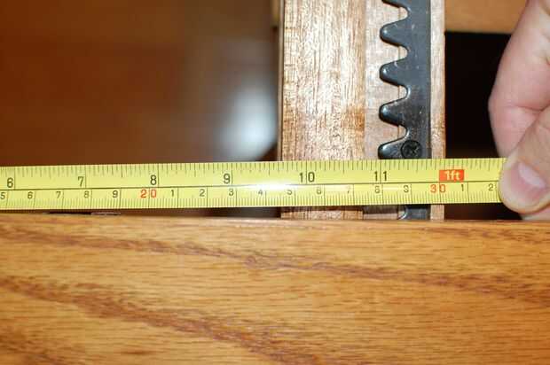 Por último, medir el espacio entre el borde de la mesa y las vigas de apoyo. En mi caso, la máquina de coser debe caber dentro de este espacio. Si la tabla que está utilizando tiene estas vigas cerca de los bordes de la tabla, entonces tal vez la máquina puede caber entre ellos de alguna manera. Depende de usted para averiguar...