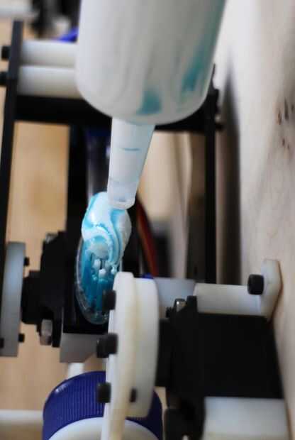 Produjo todo el sistema utilizando una combinación de fusión 360 e ilustrador. Empecé modelando cuidadosamente los servos y otras piezas compradas, diseño alrededor de las partes fijas (cepillo de dientes, jeringa de plástico). Diseñé el sistema entero para ser hecha de una combinación de 3D impresos y piezas de corte por láser, sujetada con tornillos 4-40 tanto como sea posible. Usted puede encontrar los archivos .stl y .svg adjuntos arriba. Para simplificar el proceso de diseño, analizó el sistema en cuatro conjuntos principales: cepillo de dientes, carro, dispensador y cuerpo principal. Los detalles de cada conjuntos son explicados en profundidad en sus respectivos pasos.