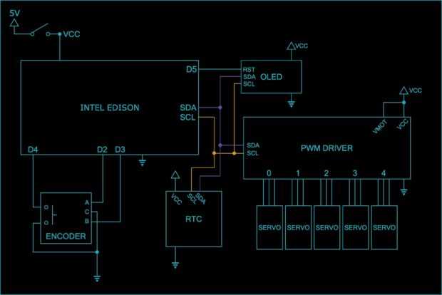 El sistema entero es alimentado por una fuente de alimentación de 5V solo 3A, que es suficiente como un único motor se acciona a la vez. El Edison potencialmente puede sacar hasta 500 mAh y el resto de los componentes (conductor del motor, RTC y OLED) extraer cantidades insignificantes de corriente. El sistema es encendido o apagado vía un interruptor de palanca mini.