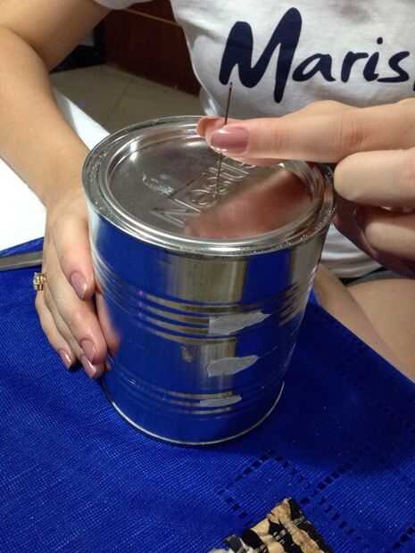 En primer lugar, tomar la aguja y hacer un agujero en la lata tapa con él.