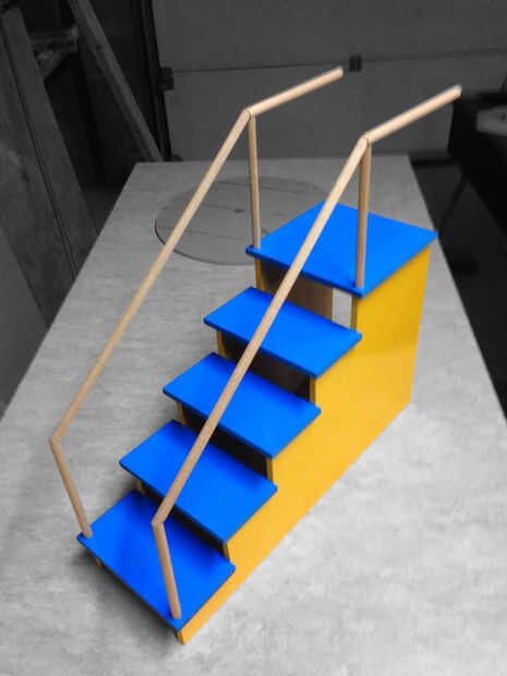 Las escaleras pueden ser hechos a mano según el siguiente plan. Si no te apetece pasar por todo este problema, usted puede acaba de poner una silla o una escalera pequeña delante de la puerta, aunque se recomienda construir las escaleras de conexión para realmente hacer que parezca una pieza acabada. Es mejor incluir una barandilla de seguridad, recuerda esto una máquina para que los niños jueguen con.