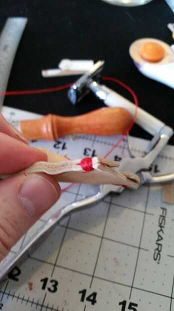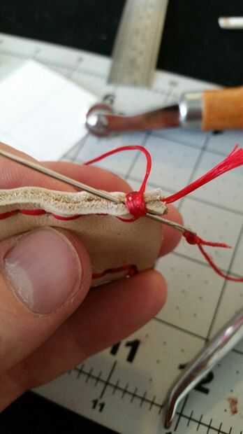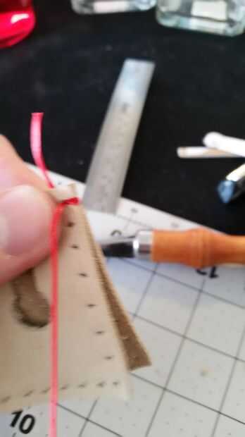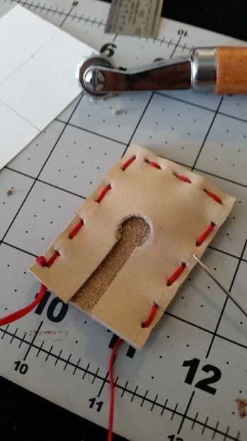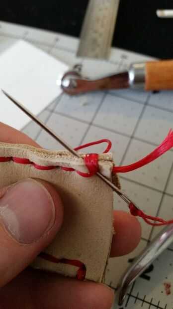 Una vez que los agujeros, tomar el hilo y la aguja y empezar con el primer orificio de la esquina. Tire del hilo casi todo el camino a través de entre las dos piezas de cuero para esa cola un poco se está pegando desde el centro de las dos piezas cuando se ponen juntos. Ahora pase el hilo a través de dos piezas de cuero y empezar entrando y saliendo de los agujeros, trabajando su camino alrededor del borde de la cubierta hasta llegar a la otra esquina.