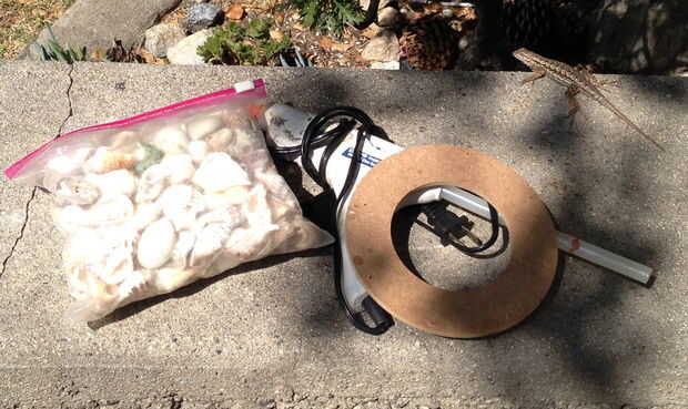 Fuentes (un lagarto escapó en la foto!): -Conchas -Anillo madera -Pistola de pegamento caliente -Shell collar o cuentas de concha pequeña -Limpiar la cadena (línea de pesca por ejemplo) -Gancho