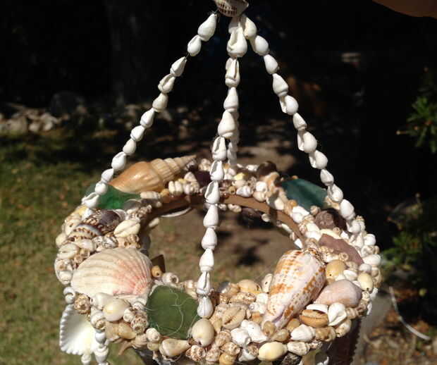 Utilice pegamento caliente para fijar conchas para el aro de madera (cubrí los lados superior e inferior).  Llena los huecos con pequeñas conchas.  Deje espacio alrededor de los orificios perforados.