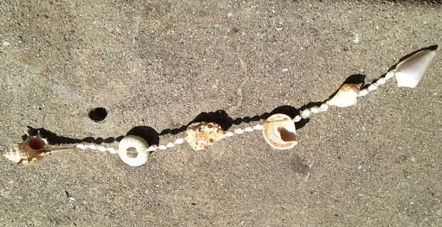 Comienzan en la parte superior y granos de la cáscara de cadena en cada cadena, a continuación, utilizan pegamento caliente para fijar una concha más grande. Repite este patrón por cada cuerda.