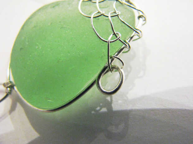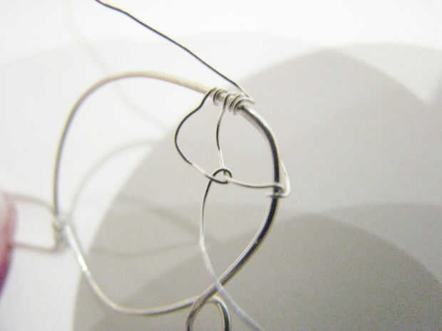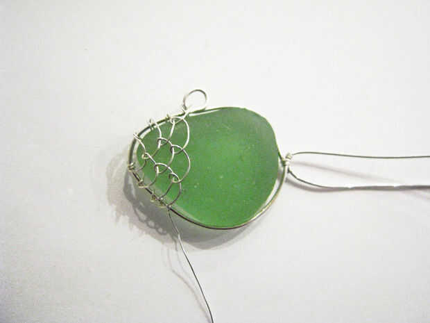 - Después de haber creado los dos lazos en la punta (para ambos lados de la pieza de vidrio de mar), utilizar la técnica de tejido de alambre en el paso 6 para crear las escalas,