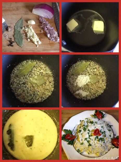 Agregar 3) en hojas de laurel, sal, pimienta y nuez moscada. Añadir la harina y cocine durante 2-3 minutos más.