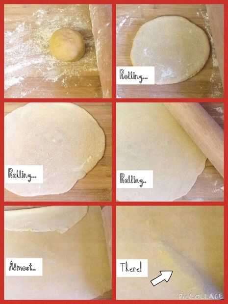 5) tomar un pequeño trozo de masa y comience a rodar hacia fuera. Y rodando... rodando... y rodando... y luego rodando más... Una vez el espesor adecuado, tiras de recorte los bordes para que sean rectas (más o menos) entonces cortan incluso (más o menos).