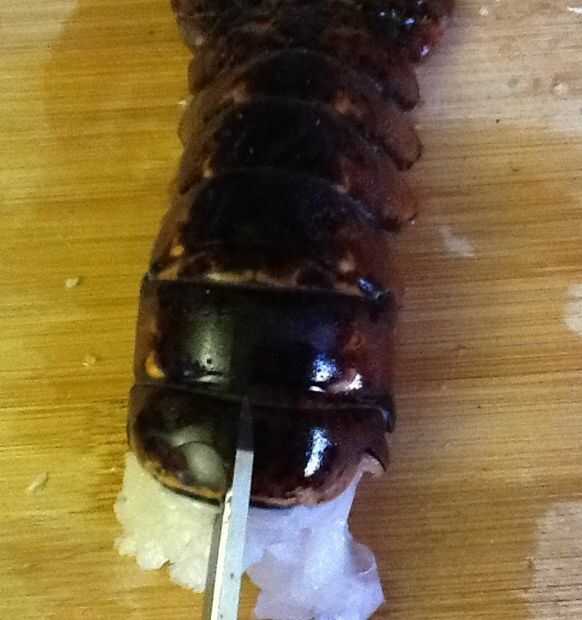 2) con un par de tijeras de cocina, cortar todo el camino hasta el centro de la cola, parando justo antes de la platija, en la parte superior. Dejar la parte inferior de la cáscara intacta.