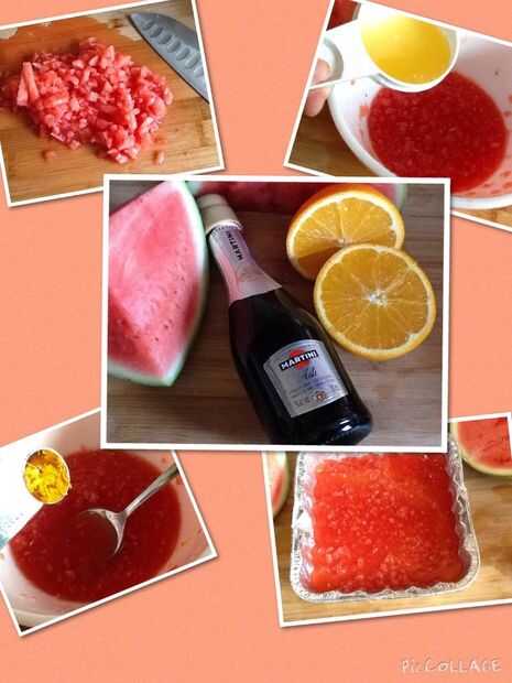 2) agregar jugo de naranja, vino y naranja cáscara. Mezclar bien y transferir a un recipiente lo suficientemente grande para estirar fino para la congelación rápida.