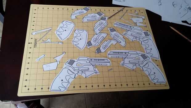 Para iniciar, impreso diez copias de los planos. Entonces lo refleja e imprimir 10 más para el lado opuesto de la pistola. Como se mencionó, hay muchos detalles a un pedazo cuidadosamente trabajada a máquina como esta. Eso significa que la estratificación, como sucede a menudo, era el método perfecto de construcción. Comencé a planificar hacia fuera cómo rebanar la pistola en partes y entonces a partir de cortar hacia fuera secciones con mi cuchillo x-acto. Inicialmente había más de 30 piezas, y he añadido algunos más adelante en la construcción. Woo!