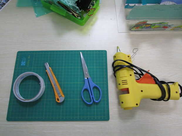 Se muestra en el cuadro 4. Usted necesitará tijeras y cuchillo para cortar las figuras de papel. Cinta adhesiva es útil al hacer algunos empalmes de papel. Es una pistola de pegamento! Puede proveer una conexión firme entre las partes de acrílico.
