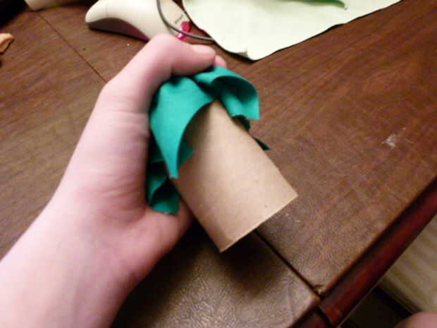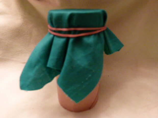 conseguir tubo de papel higiénico y un pedazo de tela y una banda de goma tomar el tubo y ponerlo en medio de la tela luego tire hacia arriba de todos los lados de la tela entonces el rap la la banda de goma alrededor de la tela y el tubo