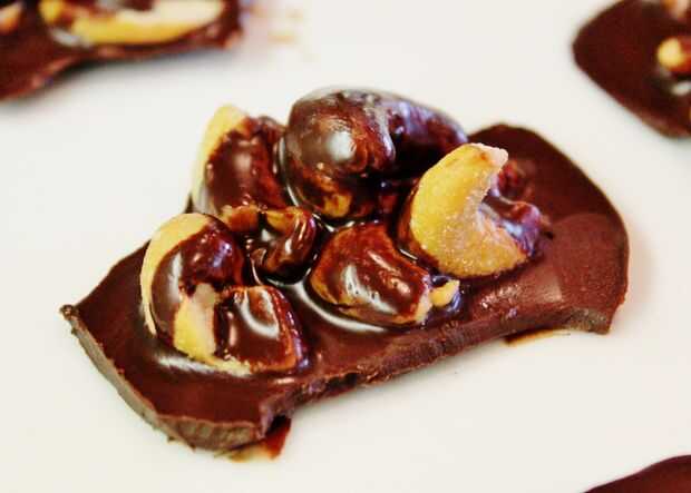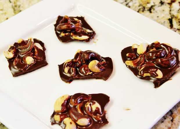 Derretir trocitos de chocolate y aceite de coco a fuego lento hasta que combinado... revolviendo constantemente con un batidor. Lugar pequeños montones de nueces de la India en un papel pergamino forrado bandeja. Salpicar la mezcla de chocolate sobre las pilas de la tuerca. Enfríe la bandeja en el frigorífico durante al menos una hora. Cortar los caramelos con un cuchillo para separar. Servir frío. Almacenar en nevera.