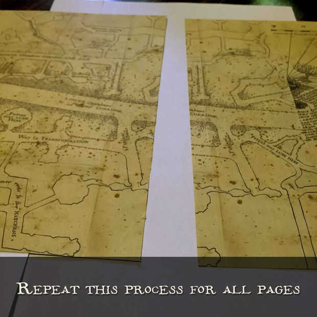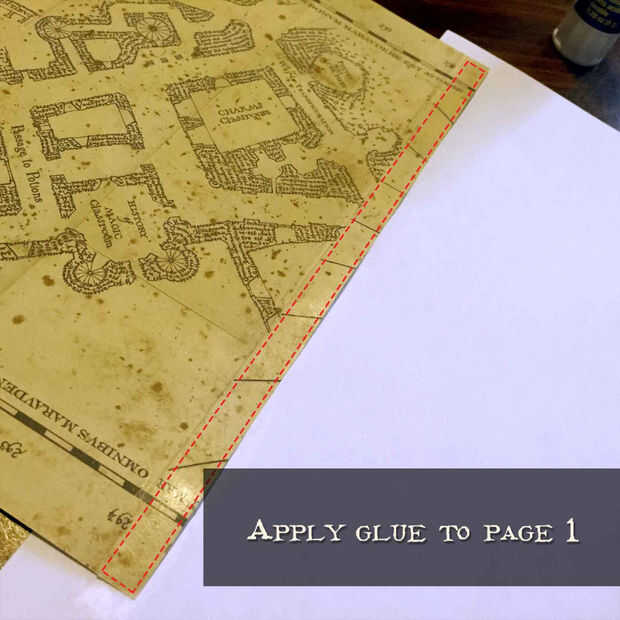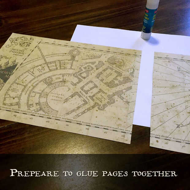 Poner las páginas en orden y hasta donde se encuentran juntos. Decidir donde debe ir el pegamento, aplica el pegamento, las páginas se alinean y presionan juntos. Utilice un trozo de papel de desecho debajo como pegamento así no sale nada en la mesa. Suavizar cualquier arruga. Continúe este proceso hasta que todas las 4 páginas se combinan en un mapa.