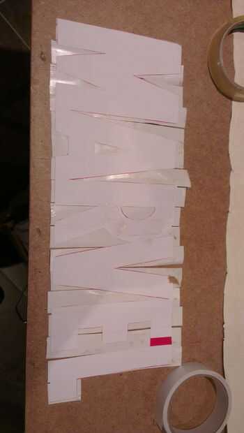 Una vez hecho esto cubrí el reverso todo con cinta adhesiva de doble cara. Asegúrese de que todos los bordes están cubiertos como se verá más adelante por qué. Luego recorte las letras otra vez por lo que tiene tu signo de maravilla otra vez pero esta vez con cinta de doble cara en el reverso. (Podría usar una hoja pegajosa ya preparada y la impresión de)